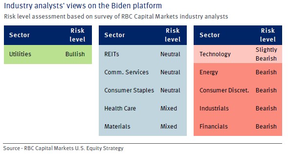 Biden’s platforms impact each sector in a different manner. According to RBC analysts, a Biden win should drive investors towards defensive and secular growth-oriented sectors, and to veer away from cyclical and value-oriented sectors. See chart below