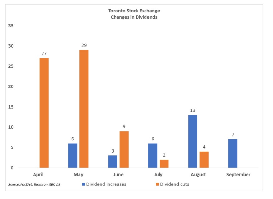 At the time of this writing (Sept 23), the TSX high dividend index is still down a whopping -20% while the broader TSX composite benchmark is down a more manageable -6%. The high dividend index is a composite of companies that pay the highest dividend yields, including: Financials, Energy infrastructure (pipelines), telecoms, utilities, and REITs. Two of the hardest-hit sectors continue to be Energy (infrastructure) and Real Estate. Due to the economic shutdown in the spring, the Toronto Stock Exchange saw 27 companies in April and 29 companies in May cut or suspend their dividends. (See Chart below). We monitor dividend trends as we believe it indirectly represents the strength of corporate balance sheets, sustained free cash flow, and the overall market health.