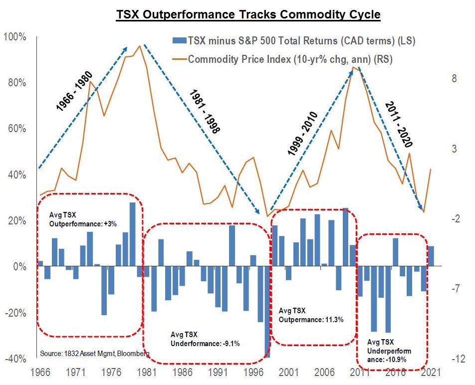 Through the decade prior to 2021, investors saw the TSX underperform the S&P500 by -10.9% (annualized). However, the fortunes for the TSX appear to have reversed in 2021 with Canada outperforming the US by roughly 6%. Over the past 55 years, investors have seen that the commodity cycle has helped define periods of TSX outperformance. The chart below summarizes the parallel relationship between commodity prices and relative TSX outperformance.