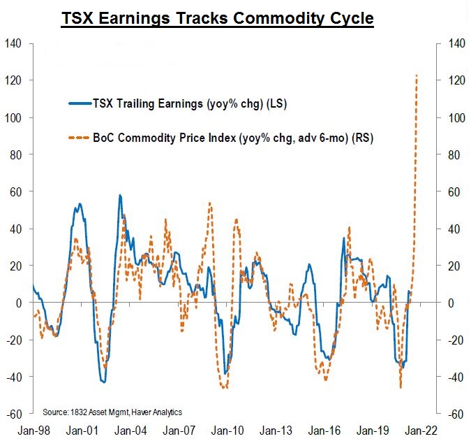 This outperformance can be attributed in part the sector mix of each index. The Energy and Materials sectors represent 26% of the TSX versus just 6% of the SP500. As commodity prices rise, corporate earnings and cash flows improve for those related companies. As the chart below displays, the year-over-year earnings growth of TSX listed companies grow in tandem with the commodity cycle. With the broad commodity indices spiking higher in 2021, investors may wonder if a new commodity cycle has started with further TSX outperformance to follow. According to Myles Zyblock, Chief Investment Strategist at Dynamic Funds, the TSX is expected to deliver one of the strongest earnings growth rates in the world this year.