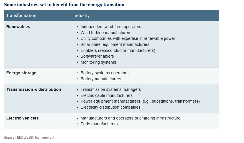 As global population growth increases the demand for electricity, the greater demand there is for renewable energy. The transition toward renewable energy involves changing how energy is produced, stored, transmitted, and consumed. For energy producers, this transition will lead to continued investments in wind farm operators, wind turbine manufacturers, renewable power utility companies, and solar panel equipment manufacturers. Once produced, the greater need for energy storage should drive investments into battery system operators and battery manufacturers. Next, the transmission and distribution needs will attract capital to benefit power equipment manufacturers and electricity distribution companies. Finally, for some consumers, their tastes are gradually changing to adopt greener technologies and products. For example, there has been a wider acceptance of Electric vehicles which should lead to continued demand for auto parts suppliers and auto manufacturers. Below is a chart that nicely summarizes the sub-industries that stand to benefit from the energy transition.