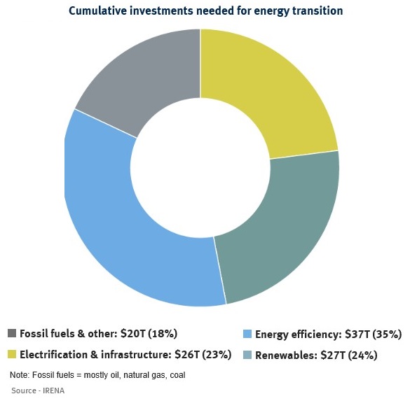Governments around the world have displayed a willingness to combat climate change and promote green technology. Currently, the EU has allocated up to $600 billion for green projects and China has reiterated its commitment to have 20% of its vehicles be EVs by 2025. Moreover, on Biden’s first day in office, the US rejoined the Paris Agreement alongside 194 other states to limit temperature changes related to climate change. According to IRENA, the International Renewable Energy Agency, $110 Trillion will be needed to be invested over the next 30 years to realize a transformation towards green energy. Below is a breakdown of how such capital could be invested.