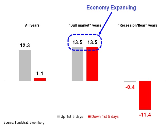 That being said, our friends over at Fundstrat Research, took a deeper dive into the data. In their study, they divided all the data between economic expansion years and economic recession years. What they found was that the 5 Day Indicator loses its meaning when the economy was expanding. Regardless of whether the first five days were positive or negative, both scenarios provided an average full-year return of +13.5% (see chart below). Parsing through the yearly data, in the last 10 instances where the S&P500 was down in the first 5 days within an expanding economy, all 10 instances provided positive returns. The most recent example was in 2016 when the market fell -6% in the first 5 days only to finish the year up +9.5%.
