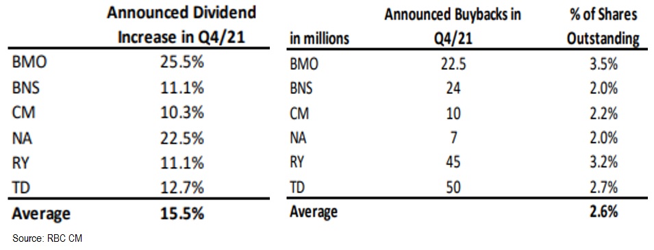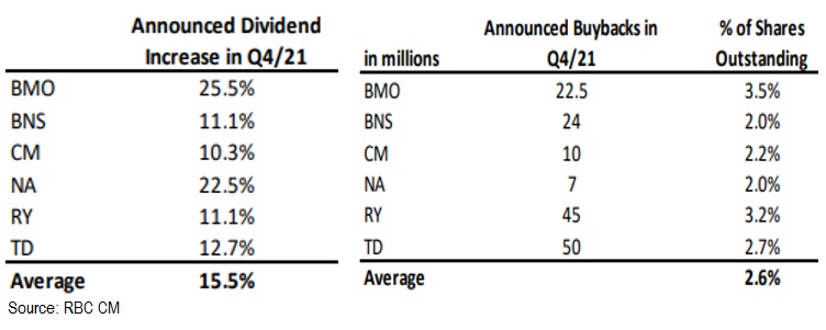 From the earnings report in Q4 2021, the banks announced an average dividend increase of 15.5% and 2.6% of shares to be bought back. A higher dividend satiates the demand for yield investors and the share buybacks help reduce the overall share count that helps boost earnings per share. RBC CM also states that they expect dividend growth in the high teens for 2022.