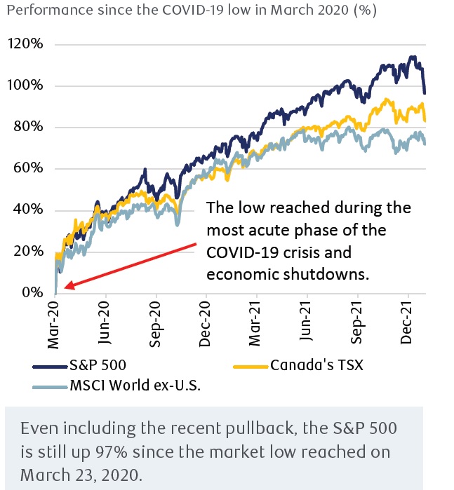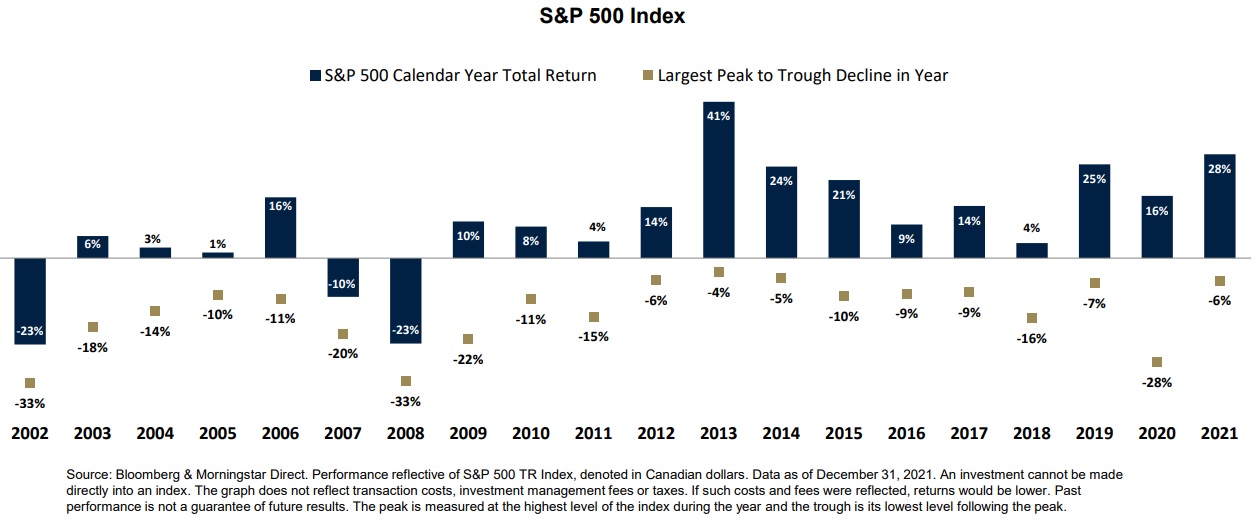 2022 is off to a rough start with markets wary of stubborn inflation, geopolitical risks, and the uncertainty surrounding the pace of interest rate increases. Although volatility has not been a stranger to investors, the swift one-month pullback of 10%+ in the S&P500 and Nasdaq100 has caught the attention of even the most seasoned investors. We recognize that even long-term investors may feel uneasy while they are in the midst of an unstable market. In times like these, we believe viewing the markets with longer-term ‘lenses’ is required to ensure emotion is not driving investment decisions. Below are some considerations to help guide investors through turbulent times.
