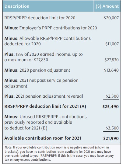 The table starts with the previous year’s ending tally of available deductions. To arrive at the deduction limit for this year’s tax return, adjustments are made by taking into consideration the deductions used last year, employer & pension adjustments, and new contribution room earned through last year’s earned income. The sub-tally called “RRSP/PRPP deduction limit (A)” provides you the amount that you can deduct for this year’s tax return.