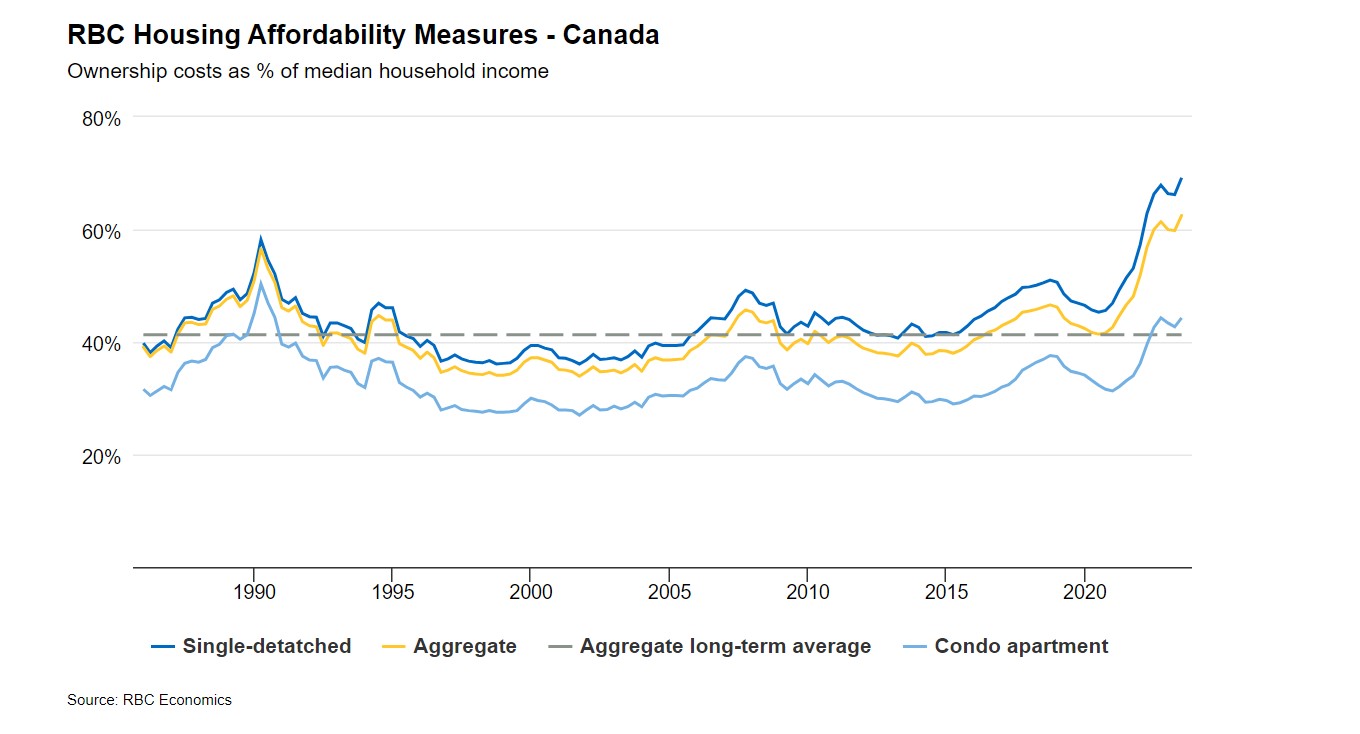 The recent RBC Housing Affordability Report dated Dec 20, 2023 confirms that high interest rates and prices continue to make it less affordable to own a home in Canada. Fortunately, the Affordability report has noted a silver lining in the horizon. The weaker housing market, since the summer of 2023, has led to price declines in parts of Canada. With the increased expectations that the next move from the Bank of Canada will be a rate cut, the cost of home ownership could be reduced. Although the RBC report cautions that any improvement in affordability likely to be modest, lower mortgage rates will help home buyers should price appreciation remain muted.