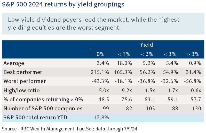 A notable observation is the relationship between low dividend yields and market outperformance. High-yielding equities are underperforming their lower-yielding counterparts. As the chart below shows, stocks yielding less than 1% have earned an average of 18%, which is much larger than the 0.9% average performance of those companies yielding more than 3%. Interestingly, the “no-yield” (0%) segment has become one of the worst-performing segments, rising only 3.4% year to date. That said, it should be of note that there are still “no-yield” stocks that have individually outperformed; the best increasing by 215%.
