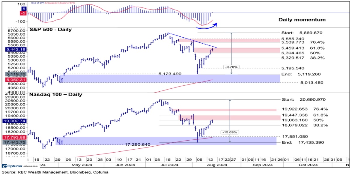S&P and Nasdaq 100 are nearing resistance levels. The markets signaled an oversold condition after the pullback, which presented a higher opportunity for a rebound. That said, with a swift relief rally underway, investors should expect some resistance and be prepared for sideways trading.
