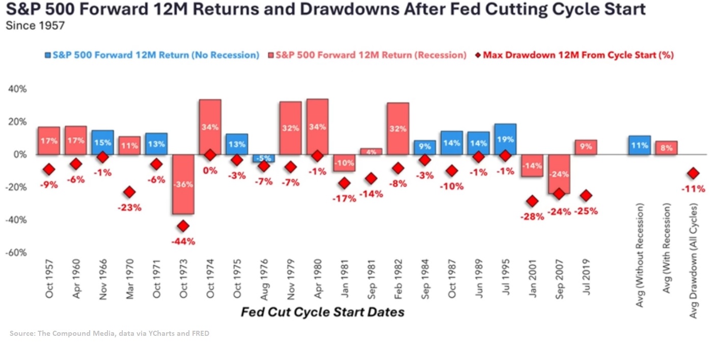 The idea of lower interest rates and less pressure on consumers and borrowers are welcome to many. However, in the short term, some investors recall historically poor stock market performance at the commencement of a cutting cycle. Since 1958 there has been 21 rate cutting cycles; And within the twelve months after the start of a rate cutting cycle, markets have experienced an average drawdown of -11%.