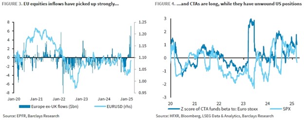 However, the tailwind may be fading as European equity inflows have already seen a meaningful influx. Further, Commodity Trading Advisors (CTAs) – which are mostly systematic traders or trend followers – have already turned long, which could signal limited upside potential ahead.