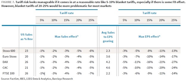 The risk of tariffs also remains a concern for Europe. Barclays suggests that the earnings impact of tariffs in the 5-10% range couple be manageable for Stoxx Europe 600 companies, as U.S. goods exports only account for 23% of their revenues. A favourable FX move (i.e. depreciating Euro against USD) could also dampen the impact. Higher blanket tariffs, around 20-25% as previously threatened by Trump, however, would be more problematic.