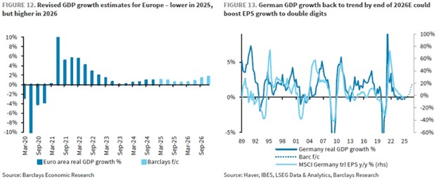 Germany presents a potential area of strength that could enhance long-term growth prospects. German lawmakers recently approved legislation to unlock hundreds of billions of Euros for defense and infrastructure spending. This landmark spending bill is expected to initiate a new phase of deficit spending aimed at stimulating Europe’s largest economy. Barclays’ economists estimate that the increased defense spending could contribute 0.3% to Germany’s GDP in 2026, with infrastructure spending adding 0.2% to GDP the following year. Consequently, they project that German growth could increase by approximately 0.4% in 2026, peaking at 0.7% in 2028.