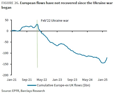 Greater progress toward a ceasefire in Ukraine could further boost investor sentiment toward European equities. The onset of the war in Ukraine triggered substantial outflows from European equities, which have not yet been recovered. This suggests that there remains substantial potential for a continued recovery, particularly when compared to the magnitude of outflows observed in recent years.