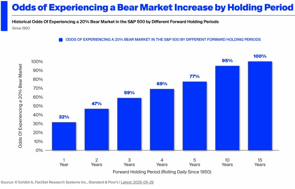 Data shows that over a 5 year period there is an ≈80% chance of experiencing a “bear market”, which is defined as a loss of 20% or more. But staying invested with the right plan and support system is often what separates the successful investors from the rest.