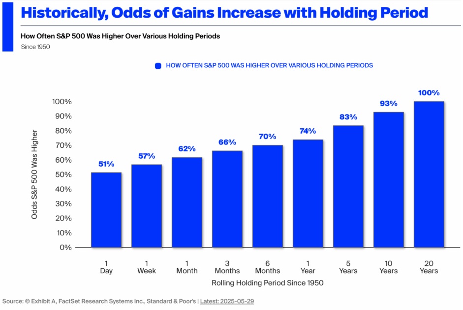 Investing does not guarantee a straight path to wealth and riches. It’s a winding road of ups and downs, and the longer you're on that road, the more likely you are to experience both. As investors, we've all heard the mantra: "time is your friend." And it's true, historical data shows that the longer your time horizon, the better your odds of experiencing gains in the stock market.