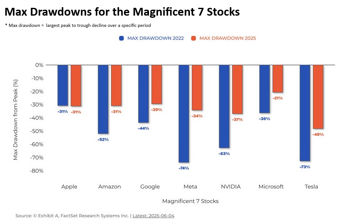 Despite the substantial returns generated by these companies, the journey has been tumultuous. Bear markets in technology, termed “tech wrecks”, are commonplace with seven such downturns over the last ten years! In 2022, the average maximum drawdown for Mag 7 stocks was -53%, with Meta and Tesla experiencing dizzying drawdowns of -74% and -73%, respectively. This makes 2025 look like a walk in the park, even though the Mag 7 still experienced an average drawdown of -33%. Are you feeling confident yet?