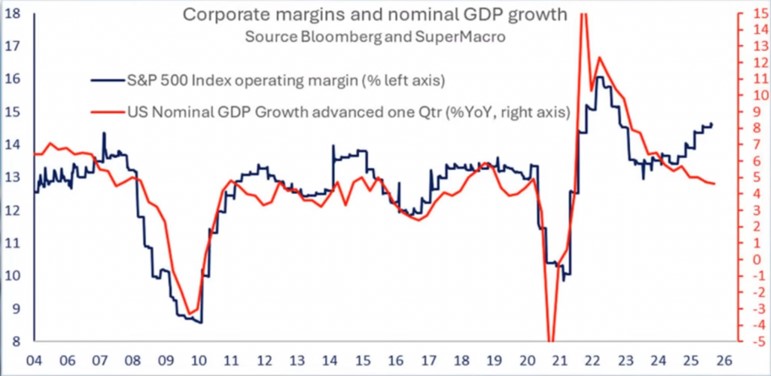 For the majority of this century, economic growth and corporate profit margins moved in tandem with one another. A look at the chart below shows how tight the relationship between the two variables have been. It’s historically been a dead heat. However, beginning last year, the variables have begun to diverge with S&P500 Operating Margins on an upward trend and US Nominal GDP growth declining.