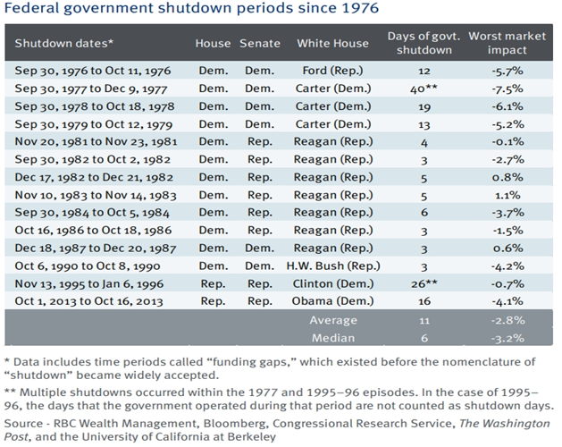 For all of the oxygen that this topic has been consuming, government shutdowns in the United States, are not all that uncommon. There are short term ripple effects on things such as services, employment (short term), and social security processing, however from the investor’s standpoint, they are metaphorically speaking…. a nothingburger.
