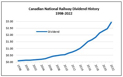 As depicted in the chart above, CNR rewards their shareholders with a growing annual dividend. In 1998, the annual dividend was only $0.088. Fast forward to 2023, the dividend has increased by 3591% to $3.16. If you had bought a share of CNR in 1998 at a cost $6.65, you would have a dividend yield on cost of 57.52%. This means in 2023, you would receive 57.52% of the original cost in dividend income. Not to mention, you would also have an unrealized capital gain of $151.73 with the current cost being $158.38 as of January 31st, 2023. If the past is an indicator of the future, you will continue to receive the increasing annual dividend income the company pays their shareholders. You can use dividend income to cover your living expenses or you can reinvest it to allow your savings to further compound.