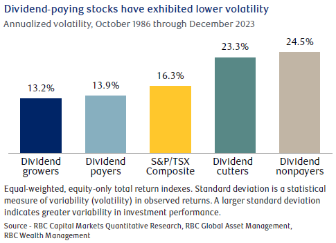 The relative stability of dividends can cushion portfolios during periods of economic uncertainty and stock market volatility, providing returns even when stock prices fall. In addition, the consistent stream of dividend income from your portfolio can help supplement your income. It will also reduce or eliminate the need to sell stock and realize losses in the short term when the stock market fluctuates.