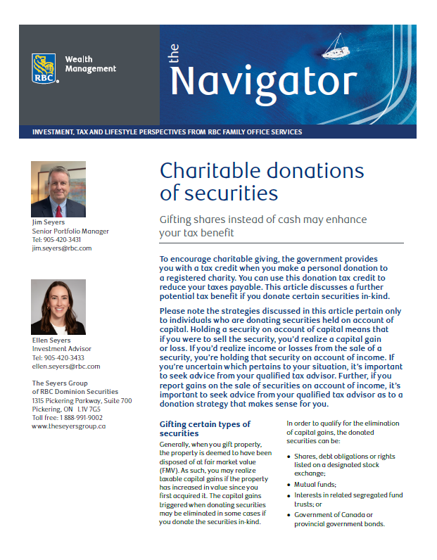 To encourage charitable giving, the government provides you with a tax credit when you make a personal donation to a registered charity. You can use this donation tax credit to reduce your taxes payable. This article discusses a further potential tax benefit if you donate certain securities in-kind.