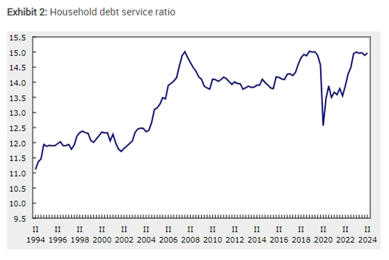 - with debt levels and interest rates coming down from earlier cycle highs, the average debt service ratio is likely to remain elevated as more homeowners renew their mortgages at higher interest rates. Back in May, the BoC noted that half of mortgage holders had still yet to refinance at higher rates, and based on market expectations for interest rates at the time (which have come down since), those that had yet to renew were likely to see a larger payment increase than those that had already refinanced. We really are entering a new cycle. Dedicating more income to servicing debt means households have less left over to spend on goods and services. Consumer spending has been sluggish as a result, declining by 3.8% on a per capita basis over the past two years.