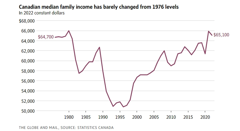 In Canada, there is another significant reason for the reality that young people can’t afford as readily the purchase of their first home: Canadian household median income has barely changed since 1976…On the other hand, the prices of homes have risen rapidly over the same period.