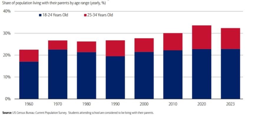 The two charts below help to illustrate why there is more inter-generational gifting or helping for home purchases. Roughly a third of young adults live at home. While this is a US number, the same applies to Canada. The share of 18 to 24 year olds that live at home (or attend college) remains large at 23%. Further, there has been a rise in the share of adults aged 25 to 34 living at home with their parents. In 2023, 10% of this subset of the population lived at home, double the rate in 1960, but down slightly from the peak in 2020 during the pandemic.