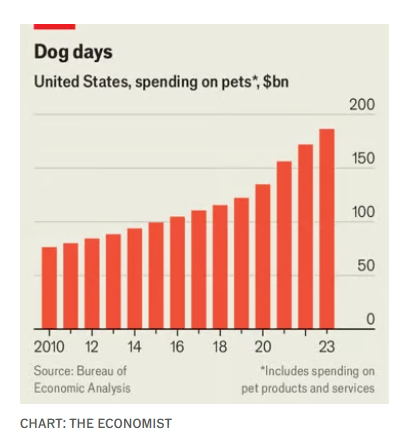 Something a little light this week. I was amazed to read that in 2023, the US spent $186 billion on their pets! This covers everything from food to vet visits, toys, grooming, and dog walking. To put this in context, while not a direct comparison, this is more than what Americans spent on childcare. These figures are roughly the same in Canada.
