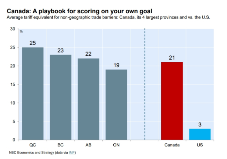 In Hockey they call this “scoring on your own goal” which is not good. According to the IMF, removing these barriers could boost inter-provincial trade volumes to levels comparable with international trade. Such reforms could also make Canada more attractive to investors by providing easier access to the entire domestic market. As the C.D. Howe Institute pointed out to us, the removal of internal trade barriers could raise Canada's standard of living and increase GDP per capita by an estimated 3.8%.