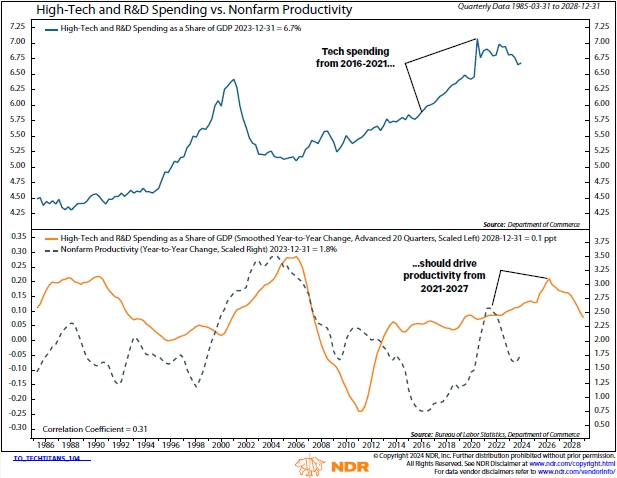 High end technology and spending on research and development tends to have a positive correlation with productivity, but with a five-year lag (see exhibit below), according to Ned Davis Research. The range of positive outcomes are expected to be broad, such as augmenting worker skills, freeing up resources to alternative uses, and improving access to educational or health care services. Conversely, it could also displace workers, cause structural unemployment, or erode job quality without sufficient control. Nevertheless, most experts believe AI will provide productivity gains but will be several years before we see economy-wide boosts in productivity.