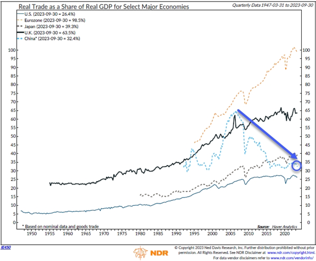 Over the past 30 years, globalization has allowed economies to benefit from their natural comparative advantage and has been a significant driver of disinflation, however, it left global supply chains vulnerable to external shocks, and the COVID pandemic exposed the risks associated with relying on a single supplier in the production process. The result was widespread inventory shortages and a surge in inflation, so to protect against future episodes, countries have begun to diversify their supply chains. So far, this has mostly meant reducing trade with China (see exhibit below), and the result of ongoing ‘protectionist’ government policies may lead to untapped comparative advantages that could drive costs higher for consumers and drag down productivity growth.