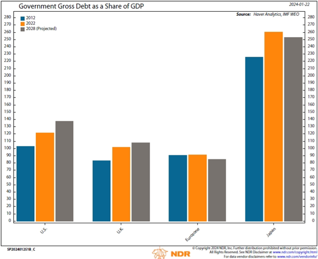 The global economy recovered relatively quickly from the COVID-19 pandemic, largely thanks to government stimulus that was injected into households to support demand, but as we know from economics – there is no free lunch. The IMF expects government debt to GDP ratios will remain elevated through to 2028 (see exhibit below) and is particularly more pronounced in the U.S., where there appears to be little appetite for policy to contain the budget deficit and debt growth. Net interest payments on U.S. debt as a percentage of total government outlays is projected to rise to 14.5% by 2033, from 12% today, according to the Congressional Budget Office (CBO), and that can have some implications including: 1) reduced future government spending, 2) upward pressure on interest rates and bond yields, and/or 3) higher inflation.