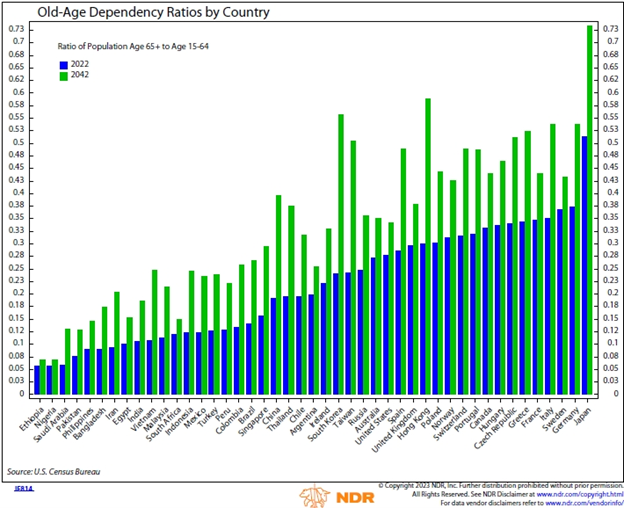 Aging demographics are expected to persist in most developed and some emerging markets in the coming decade, as the population dependency ratio (population age 65+ / population ages 15-64) is projected to increase globally (see exhibit below). Experts believe this could impose strains on government budgets and potentially manifest into slower labor force growth. Reduced aggregate demand also tends to come alongside an aging population, which puts downward pressure on GDP growth.