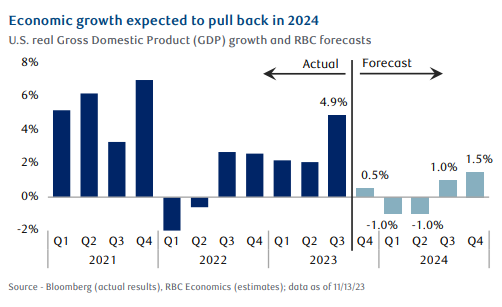 Our firm’s investment team believes the combination of high rates and restrictive lending standards is a recipe for declining growth, particularly in regions like Canada and Europe where growth figures have been underwhelming. There is the chance the U.S. and other regions avoid a recession, and instead experience a “soft landing”, where growth slows but does not outright decline. See below our expectations for US GDP in 2024.