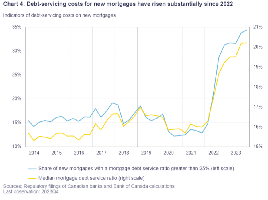 According to the Bank of Canada’s recent annual Financial Stability Report (FSR), mortgage costs have driven the average mortgage debt service ratio sharply higher, from between 10 and 15% over the past decade to a level now exceeding 20% (see chart below). This means mortgage holders are spending a larger portion of their income on servicing debt each month. The FSR report notes that households with mortgages have been managing the higher interest rate environment relatively well, with indicators of stress remaining below their historical averages. This resilience can be attributed to a combination of factors, such as higher incomes, increased savings, and reduced discretionary spending.