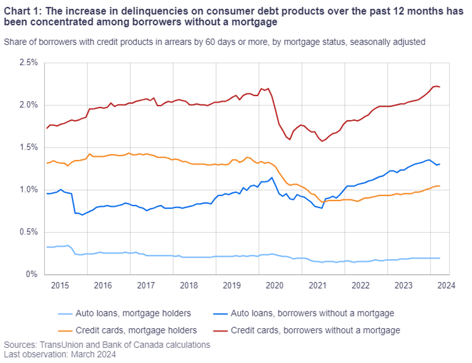 The report suggests that many households with mortgages originated in 2021 and early 2022 may face more intense financial pressure in the coming years. Home prices were near their peak back then, and mortgages were initiated at the ultra-low rates available at the time. These homeowners may encounter financial strain due to much higher payments upon renewal, compounded by holding large mortgage values relative to their incomes, and equity in their homes that has either remained stable or decreased somewhat. In other words, much of the impact of higher interest rates on mortgage holders may still lie ahead.