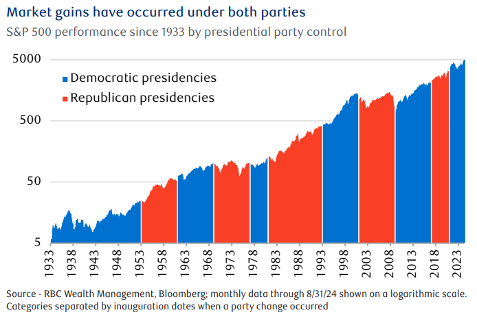 In case you missed last month's blog we talked about the realities of the US presidential power. Whether Harris or Trump wins the presidency we believe the checks and balances built into the system will prevent either party from fully executing their agendas. This has historically worked in the stock market's favour. This month, RBC Wealth Management has released the article Harris and Trump on the Issues where we review the key policy differences that matter most to the economy and stock market. We review taxes, tariffs, regulations, and end sector and market impacts. Presidents don't govern the stock market and there has been market gains under both parties (see the chart below). Staying disciplined and invested (not making drastic changes based on election outcome) will help keep you on the trajectory towards achieving your long-term financial objectives.