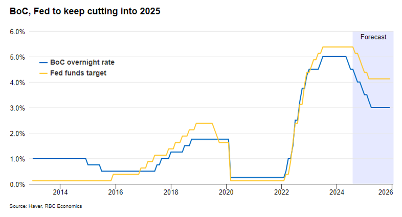 In the US, softening labour markets (unemployment has risen from historic lows) coupled with lower inflation (2.5% headline CPI) sets the stage for the Federal Reserve to begin it's easing cycle. We believe the Fed will cut by 25 basis points at the September meeting, but the market is still split on a potential 50 basis point cut. Either way, we expect further gradual easing into 2025. The chart below illustrates the different path of rate cuts for the US and Canada. Forward Guidance: Our Weekly Preview - RBC Economics.