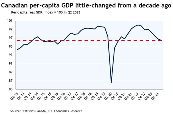 Canada’s economy has stalled. Though the country as a whole has avoided a recession, digging deeper shows Canadians themselves are hurting. The chart below presents Canada’s real GDP per capita, which takes the overall measure of the Canadian economy (adjusted for inflation) and divides it by the population, thereby providing a sense of the average Canadian’s economic position. The chart shows Canadians have been in a recession for years now, brought back to the same position they were in a decade ago.