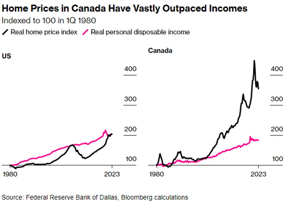 Core issues need to be addressed for the situation to improve. One of these is productivity, which has fallen alongside an overly ambitious immigration policy that has outpaced the economy’s ability to create quality employment. But the bigger issue is housing. The chart below illustrates this neatly by comparing our situation with that of the US. It shows that home prices in Canada have largely dislocated from income. We are unsure how long this situation can be sustained.