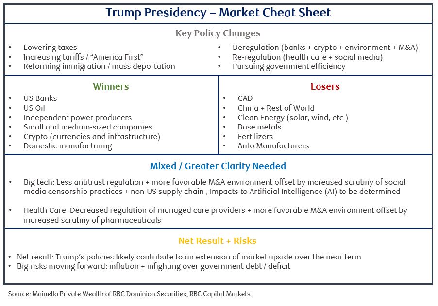 Providing a complete breakdown of the “Trump 2.0” platform would make this newsletter too long for its intended scope. Instead, we thought it would be helpful to summarize the key policy changes he has proposed, their potential winners and losers, and the net results and risks we see moving forward. You can see this in our “Cheat Sheet” below.