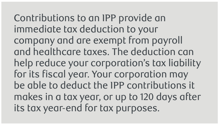 Contributions to an IPP provide an immediate tax deduction to your company and are exempt from payroll and healthcare taxes. The deduction can help reduce your corporation’s tax liability for its fiscal year. Your corporation may be able to deduct the IPP contributions it makes in a tax year, or up to 120 days after its tax year-end for tax purposes. For the contributions to be deductible, they must relate to service performed in the current tax year or a previous year. Contributions that relate to service after the end of the tax year wouldn’t be deductible. Investment management fees may also be tax-deductible if they’re paid outside the IPP by your corporation.