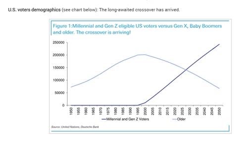 The kids are alright – they’d better be! Oh ohhhhhh. U.S. voters demographics (see chart below): The long-awaited crossover has arrived. Soon the pups will be running the dog show as Gen Z and Millennials will exceed boomers in boom town! Foreshadow… I see President Taylor Swift in 2032. Gross.