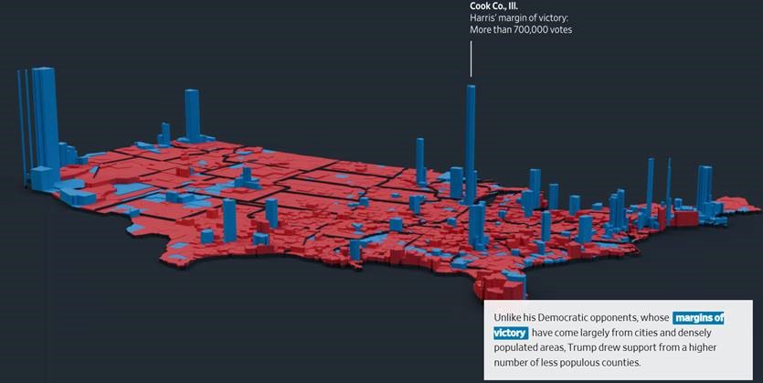 Lumpy jam: Like baseball stats, which are endlessly analytic, Americans love statistical views of the electoral leanings. In this brilliant interface, the Wall Street Journal shows how the Democratic party vote was concentrated in cities, while the Republican support was spread more thinly and widely across the nation. It’s not so much a new insight as a great visual.