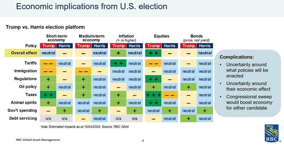 Let your eyes glaze over (did I even need to say that?) and you can see a bit more green under the proposed Republican platforms than on the ones from the Dems in the RBC graph below. But congress is its own animal, regardless of affiliation (oh how I wish it was this messy in Canada – seriously. Quick reminder here – political arguments are good inasmuch as they represent broad coalitions).