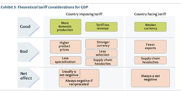 Impact: Countries generally use tariffs to protect domestic industries by raising the cost of imports and encouraging consumption of locally produced goods. Tariffs also provide a source of government revenue. However, in practice, the benefits to the country imposing the tariff are often offset by several forces. (See chart below). Domestic businesses that rely on foreign inputs to produce their own goods may face higher costs, and retaliatory tariffs can harm exporting industries.