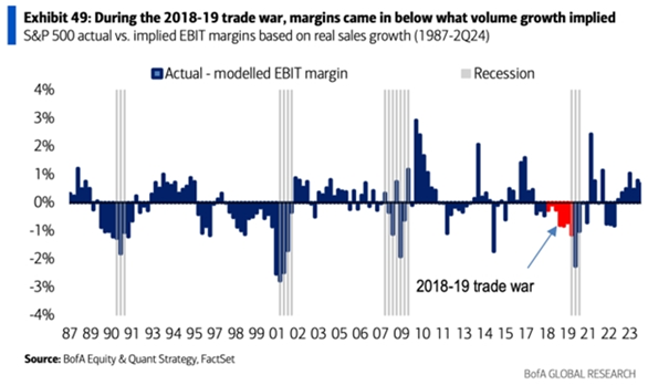 Margins are likely to get hit by tariffs (see chart below): “We estimate that there was about a 60 bps hit to EBIT margins from increased tariffs during the 2018-19 trade war. A 60 bps hit to current EBIT margin would translate to a 4% hit to EPS. 60% China/10% rest of world tariffs proposed could be done without congressional approval—we estimate a 3% hit to S&P 500 EPS but 60% may be a starting point for negotiations. Retaliatory tariffs would hurt U.S. multinationals, and the fact that intermediate goods are included is more problematic for Tech and Industrials than 2018's tariffs, in our view."