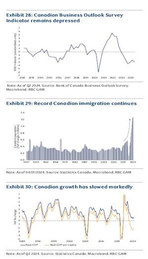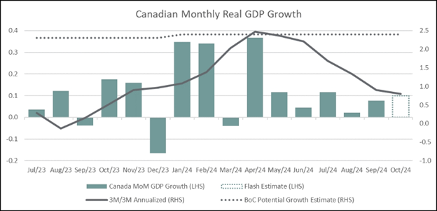 Q3 GDP in Canada fails to meet Bank of Canada’s expectations. Last week’s income and expenditure-based GDP report indicated that Canadian real GDP grew at an annualized pace of +1.0% in Q3 2024. GDP growth in Canada appears to be tracking well below the BoC’s potential growth estimates of 2.4%, indicating growing slack in the economy.